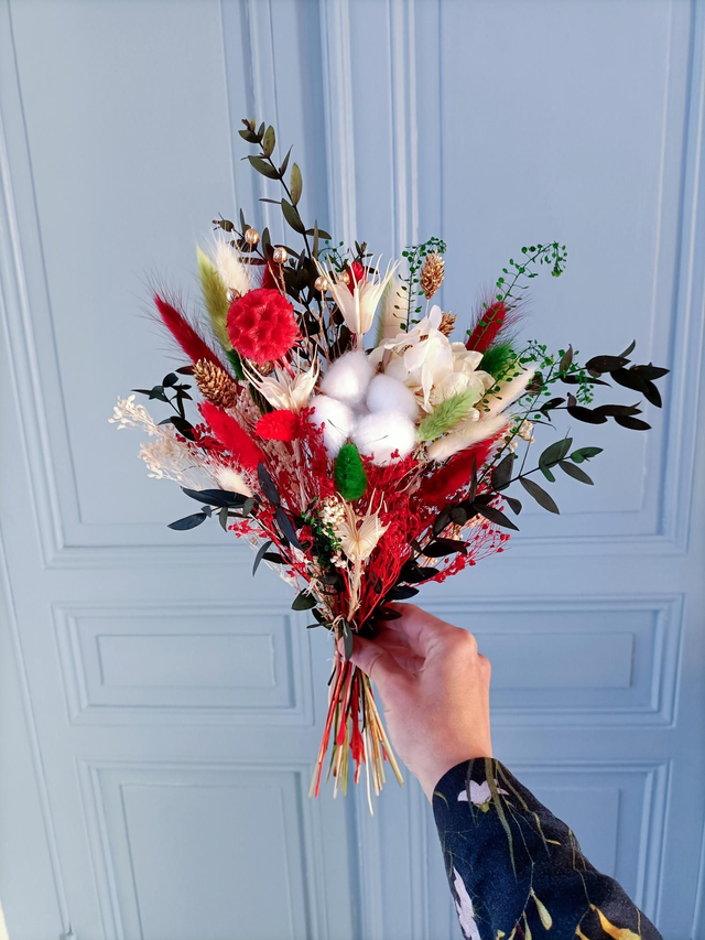 Bouquet en tons rouge, blanc, vert et touches dorées, comme un éclat chaleureux des jours de fêtes !