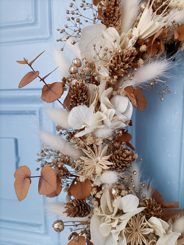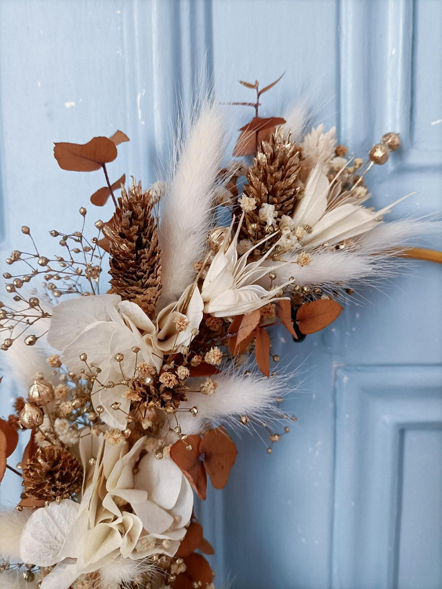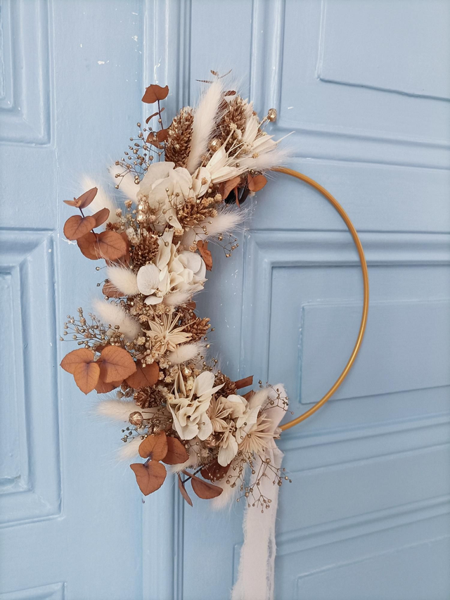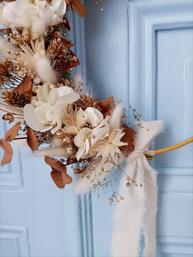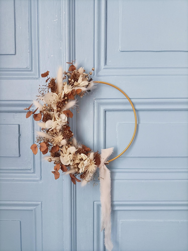 Chaque couronne est une pièce unique entièrement réalisée à la main, avec des fleurs séchées et stabilisées soigneusement sélectionnées.