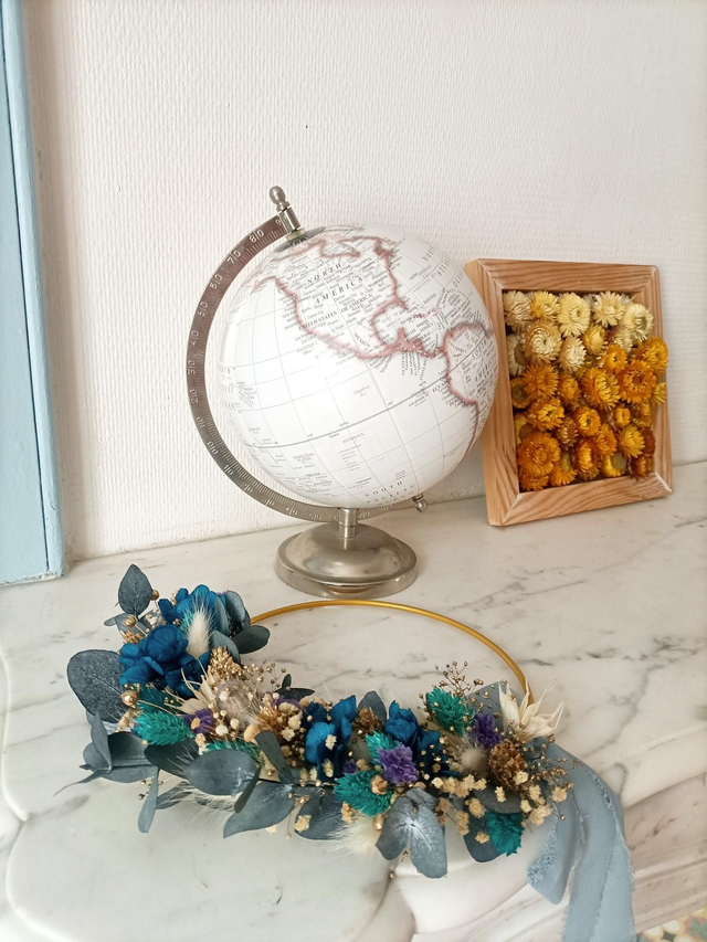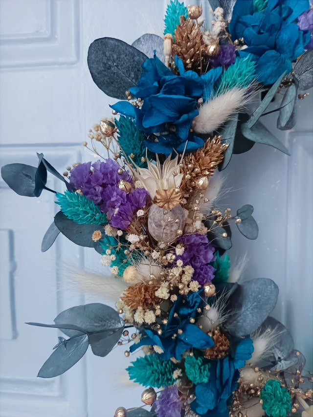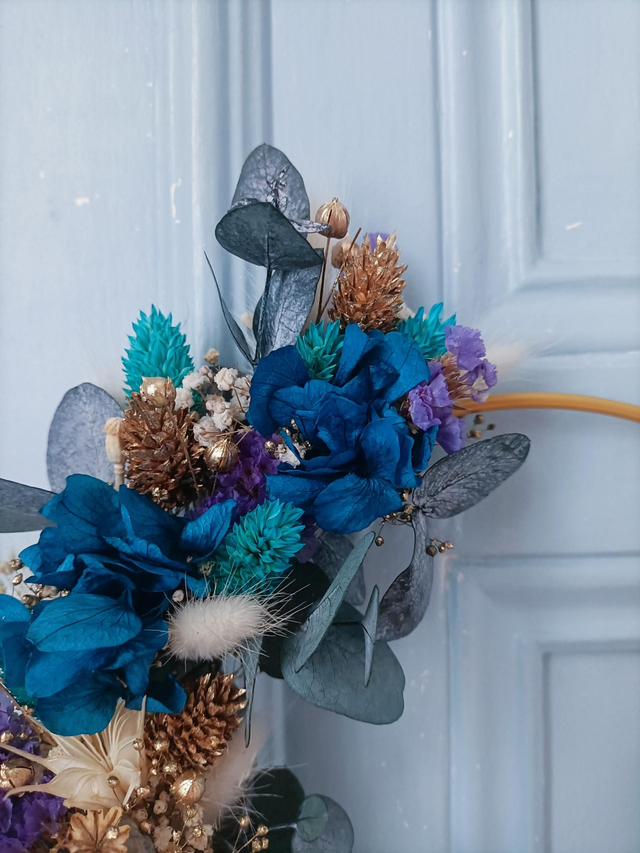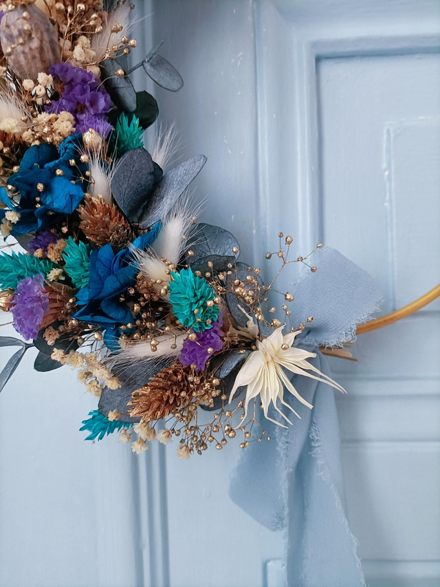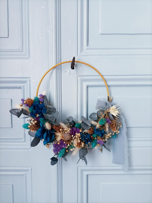 Chaque couronne est une pièce unique entièrement réalisée à la main, avec des fleurs séchées et stabilisées soigneusement sélectionnées.
